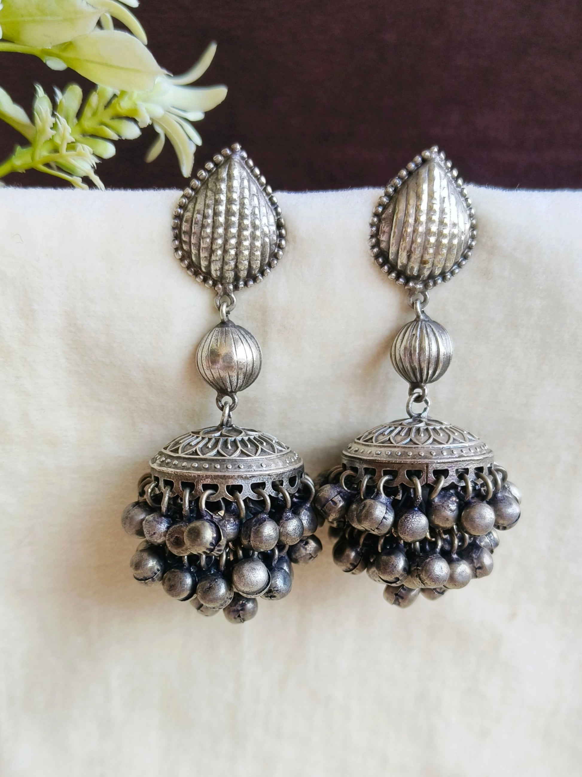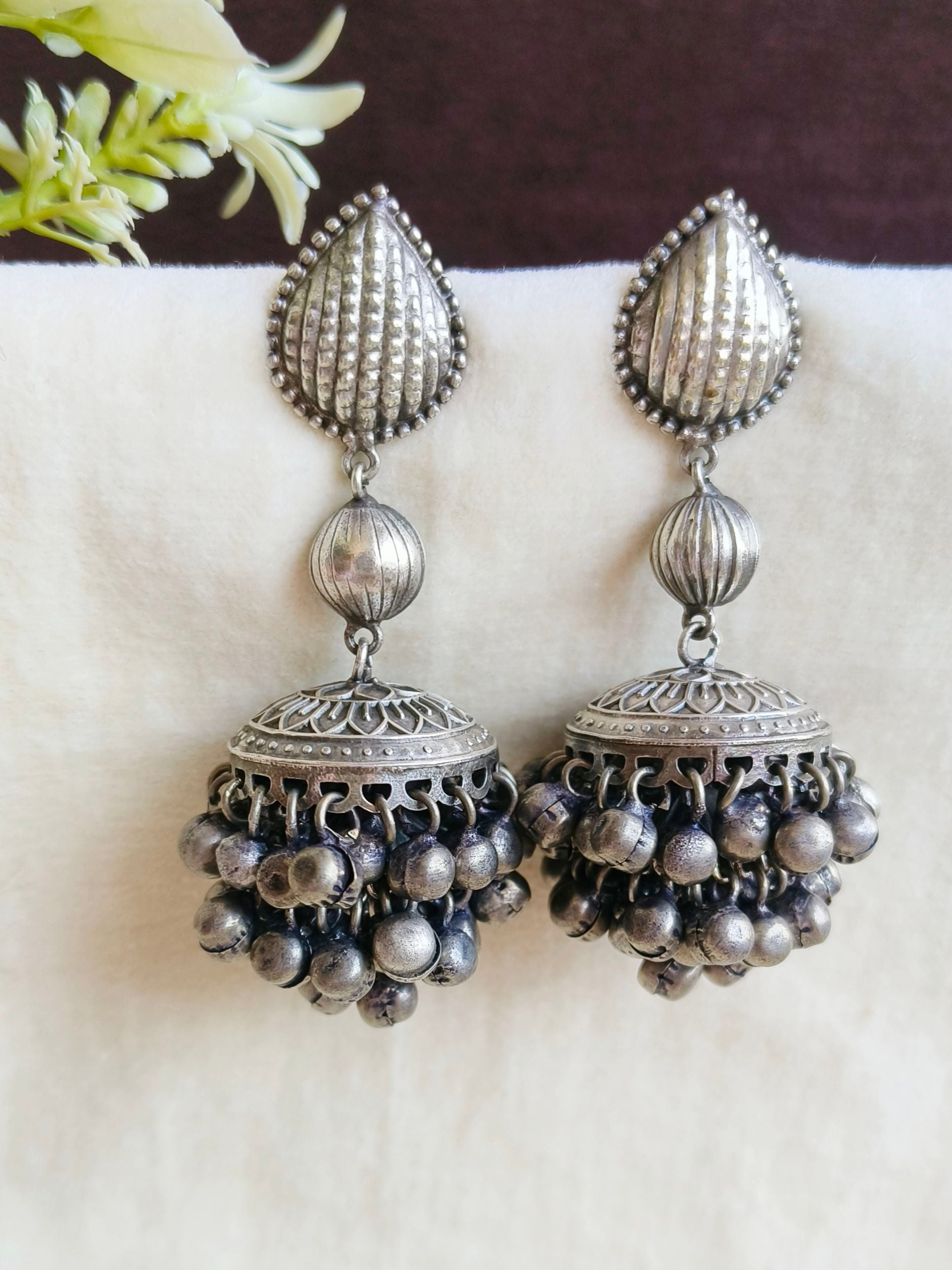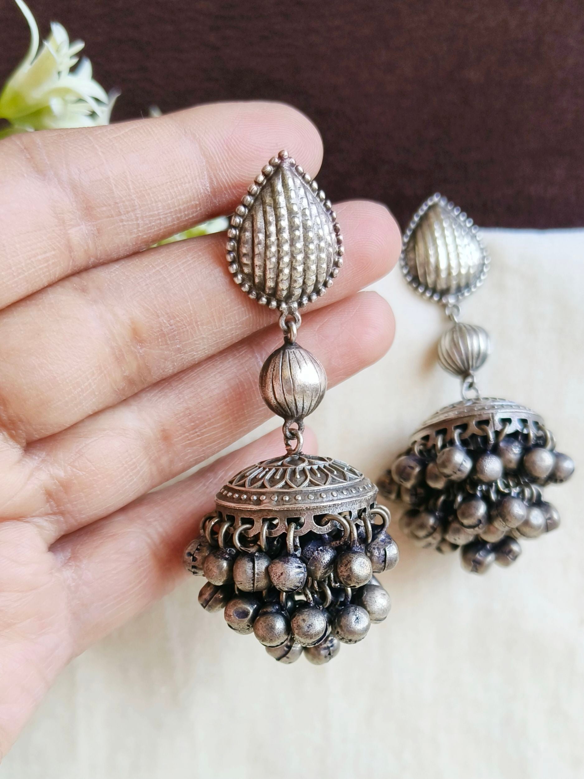 The jhumka in this design is completely handmade. In handmade pieces, textures, designs, filigree, and embossing may sometimes vary slightly, and certain details may not be exactly the same. So, due to this, the design may differ slightly, but it will not be considered a wrong or incorrect product and will not be eligible for return on that basis. If you have any doubts, you are welcome to contact our team.